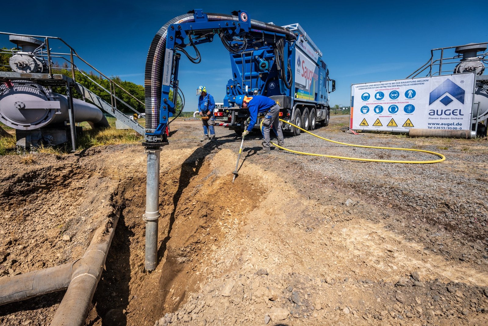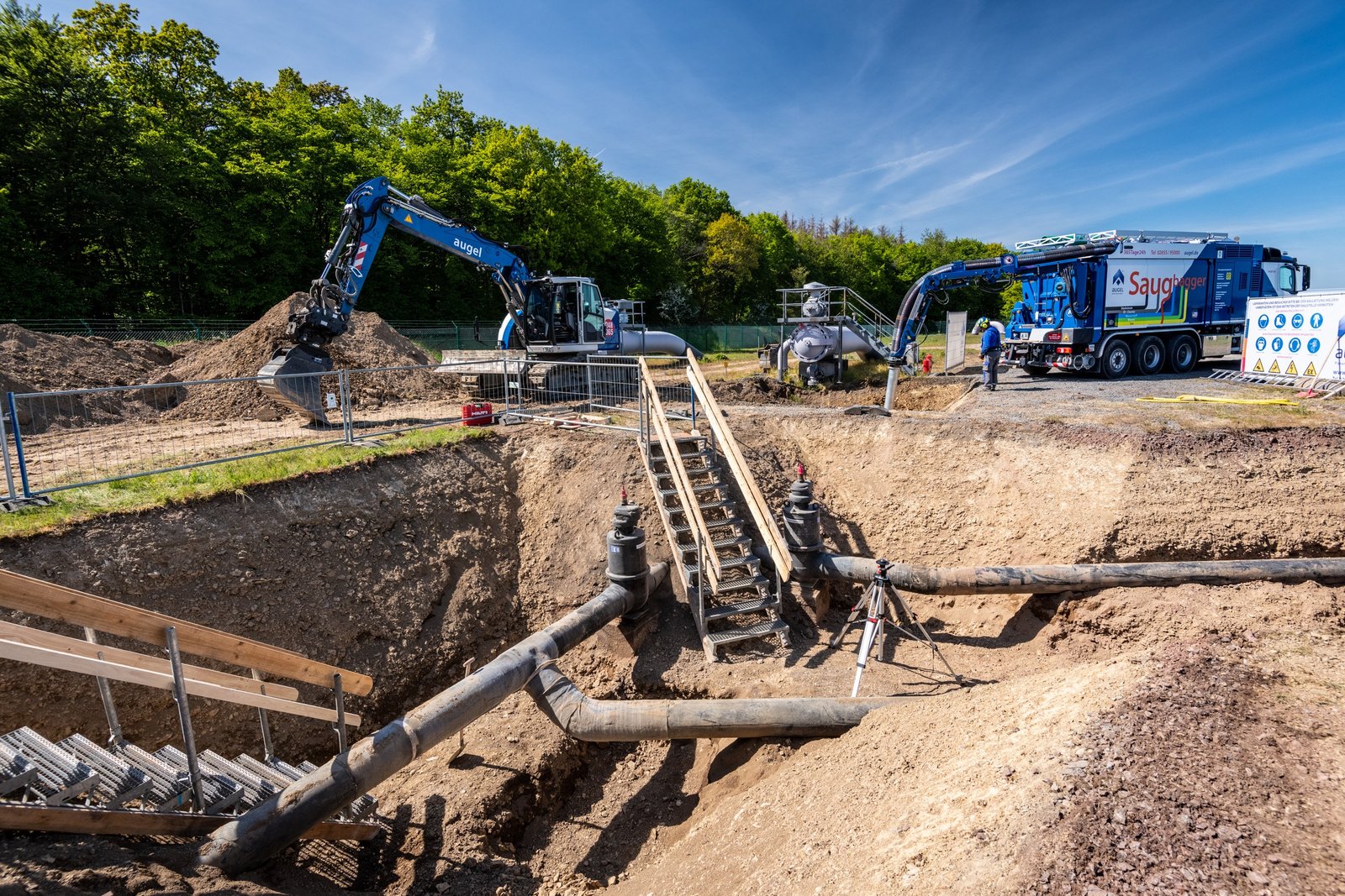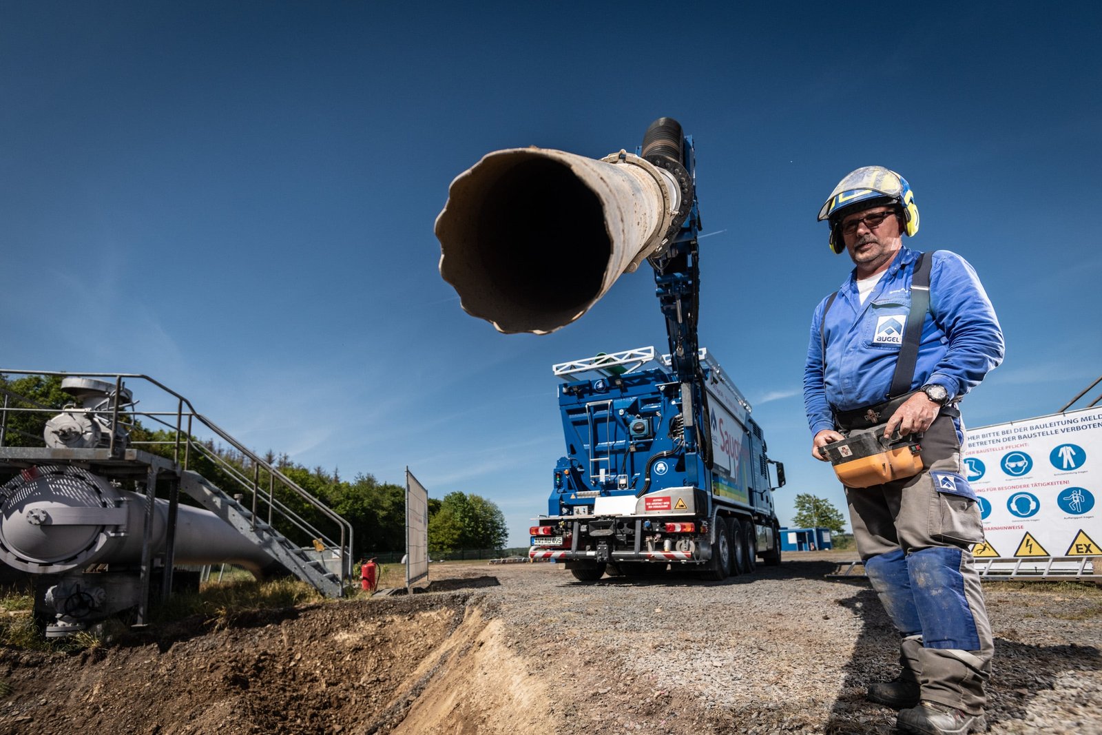 In der Eifel führt die Firma Augel seit Ende April 2020 diverse Tiefbauarbeiten im Auftrag der TENP durch. Ein großer Bestandteil der Baumaßnahme ist die Umlegung einer Gasleitung DN300 in Auderath. Dazu werden diverse Maßnahme rund um den Rohrbau durchgeführt. PE-Altumhüllungen werden entfernt, und diverse Trennschnitte durchgeführt. Anschließend wird der Leitungsverlauf angepasst, gefolgt von Schweißarbeiten nach DVGW GW350 mit anschließender PE-Nachumhüllung der Schweißnähte an blanken Rohrstücken sowie Rohrbögen.